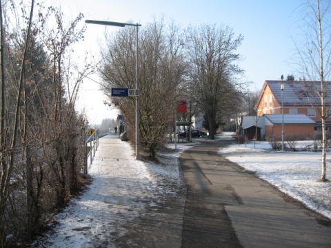 | D アルトナーディング駅の駐車所の脇を走る廃線跡。 | E カーブがあやしい! |