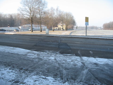 | F ミュンヘナー通をクロスしていた廃線跡。 | G この道路を横切っている舗装部分が廃線と推測。道路の向こうで右にカーブしていく。中央の建物のあたりで左にも分岐線があったようだ。その先は温泉「テルメ」の施設がある。 |