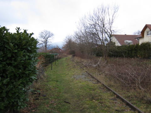 | D Cの住宅側に伸びる廃線。 | E ボッセ通り(Chemin de Bosset)の下を走る廃線跡。 |