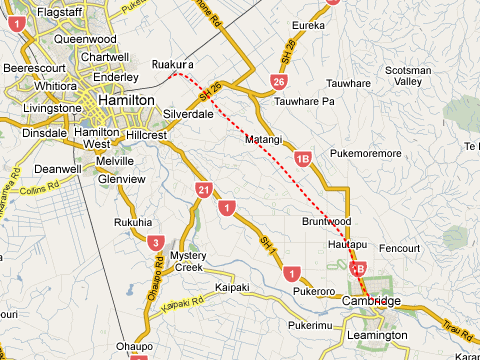 | @ 簡単マップです。この支線にはケンブリッジ、マタンギ、ルアクラの3つの旅客駅があったようです。 | A ケンブリッジ駅の跡地。物流ヤードになっていましたが、当時の駅サインが保存されています。 |