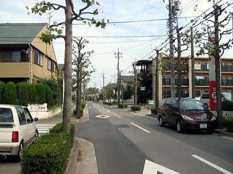 | B Aの先がこの写真中央、木の左側につながる。ちなみに、ここはスーパーの駐車場だったが、2005年10月にはスーパーがなくなり民家が立ち並んでいた。 | C 子供(当時4歳)の頃の記憶だと、県道39号線に併走していたような記憶があるのだが・・・ |