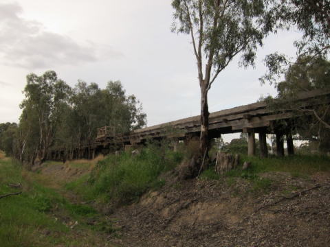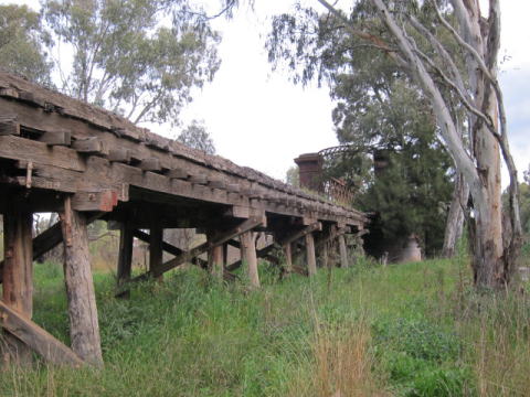 C マランビジー川へ向かって伸びる木橋跡。 |