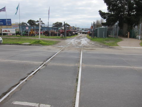 | 23 農耕機器取り扱い会社の敷地内へ延びる廃線跡。 | 24 街の中心地に残る軌道敷跡。観光用モーニントン駅方向をみています。 |