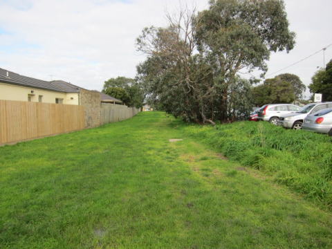 | D フランクストン・フリンダーズ道路からバクスター駅方向を見た図。草の中にレールが埋もれています。 | E 踏切跡。 |