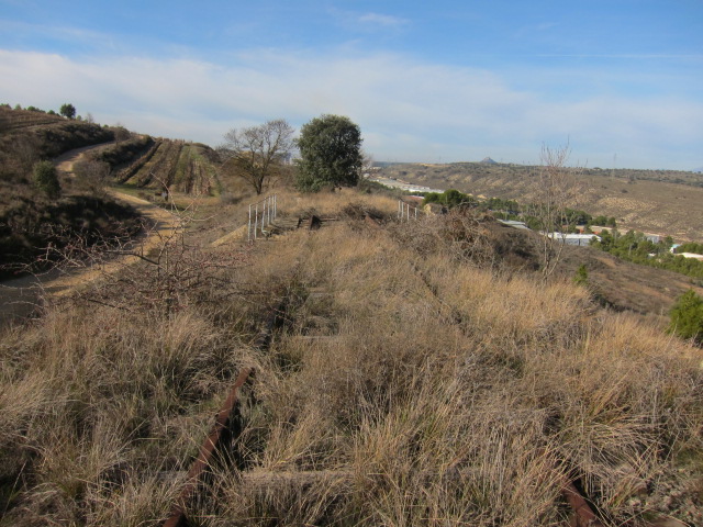 ⑧ ⑦の位置からの景色。遠くにピレネー山脈が見えます。また中央やや右にはこの路線最大の遺構であるトンネルがあります。 |