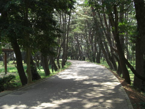 | @ 高師緑地の中を走る廃線跡。高師駅方向をみており、右の柵の裏に渥美線が走っています。 | A 緑地(公園)内をカーブしていきます。高師駅方向 |