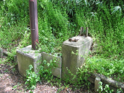 | J 公園へのコンクリ橋下に残る架線柱用の機器。(二の丸橋) | K Jの北側に直線で延びる廃線跡。 |