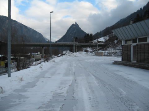 | 21、また台座が・・・ | 22、イン川に近い旧線部分は、切り開かれて河川敷公園の駐車場になっているようだが、冬場は雪の中! |