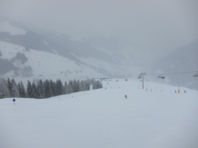 | ⑨ 6SB Eggalm Nord リフトの山頂駅近辺のコース、ここはパウダーで滑りやすかったが、調子に乗っていたら写真右の圧雪車の跡にやられてしまった・・・・ |