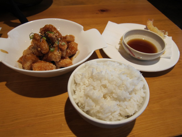 番外編2 ジャパニーズレストランで頼んだメニュー、ご飯は普通に美味しかったです。左の唐揚げは不思議な感じでした。右の食べ終わってしまったエビ天は非常に美味しかったですね。 |